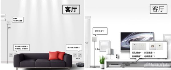 客厅一向是聚会当中重要的场所,大多数人在大多数时间会聚集于此,如果之前开关插座的布局没有做好那可就麻烦了。如果你虽然是独居,但喜欢与朋友聚会,那客厅在家居电气设计时也应该提前规划。空调设计单独回路,建议使用带开关的16A三孔插座,因为春秋两季可能会长时间待机,可以避免频繁地插拔;沙发区域事先量好长度,避免插座被遮挡,建议使用10A五孔带USB插座,好处是可以同时供应多人的充电需求;电视区域考虑HDMI信息插座的预埋,可以使用多种多媒体设备,如switch、投影仪等,方便多人游戏,避免无聊;还可以安装AP面板,加强客厅空间的无线信号,使网络更为流畅。