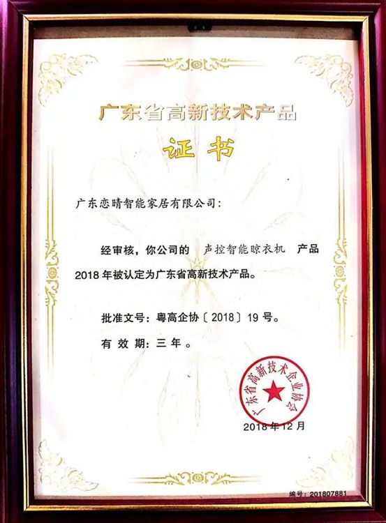 2018年 恋晴被评为广东省高新技术产品