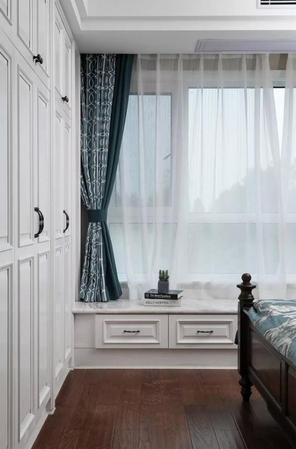飘窗面积也很大,洁白的窗纱增添了朦胧感。