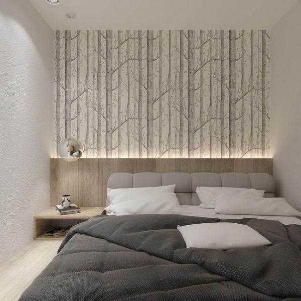 卧室地台上方铺上一张柔软舒适的床垫,就是一个舒适的休息空间,床垫旁边设计了一个不大的木质床头柜,收纳随手的书籍、手机等物品。床头背景墙做了木质的半墙台面,台面后方嵌入了灯带,柔和的灯光让空间更加温馨。