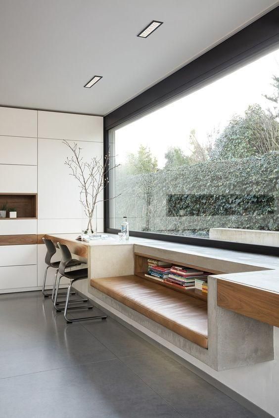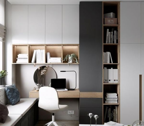 没有飘窗的也无所谓,可以靠窗打一排矮柜,上面坐人下面收纳,侧边照例做书桌,也是一样的用法,除了简单置物,拿上一两个靠枕,还能充当靠背,更讲究舒适的,可以适当调整成斜面的。