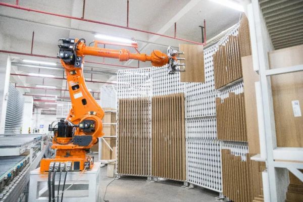 而索菲亚领先的4.0智能车间,采用国际一流柔性生产线,产品制造全流程智能化,从智能立体原料仓出发,板材全程不落地,加工准确率100%,板材利用率提高11%,每年节约成本近1000-1200万元;打造行业首个智能分拣系统,根据订单信息智能码垛分拣准确率100%,速度比人工操作快5倍,生产效率国际领先。