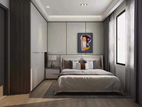 衣柜和床头柜一体式设计,整体感更强。在床头柜上方留出两个开放格,收纳护肤品和书籍,保持床头柜的干净整洁。