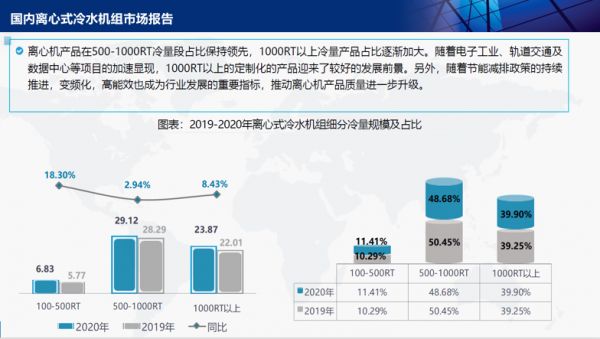 从品牌角度上看,目前在国内四大品牌就是约克、特灵、开利、麦克维尔市场品牌占有率比较多一点。离心机产品在500-1000RT冷量段占比保持领先,其中占比在500RT以上比较多一点。