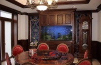 灯饰与餐桌呼应得恰到好处,同样的圆形寓意着团圆,阖家欢乐的美好。一旁的木质餐柜和摆钟给予空间一种自然平衡之美,让古韵底蕴从目及所处施然而起。