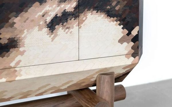 被巴黎装饰艺术博物馆所收藏的cloudInChest边柜,由近3000块、16种不同的木材手工切割而成,像钻石切面一样包裹着这件艺术品,如同 一朵像素化的云出现在面前,并邀请人们去旅行。