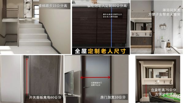在方便性上,各个房间都有针对性的设计,比如卧室预留床边收纳空间,确保随时取用水杯、电话等,并且方便起床时搀扶。老人房门及套内卫生间门加宽10公分,方便两人相互搀扶;卫生间宽度超80cm,方便子女照顾老人。另外,开关面板离地60公分、橱柜为老人定制80公分高,通过全屋定制老人尺寸,方便操作。