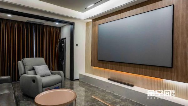电视背景墙同样采用了木饰面板,暖光灯带当然不可少啦,营造出满满的氛围感。客厅宽度较窄的户型可以选用壁挂式投影仪+激光幕布,节约空间让整体更为统一的同时,在家也体会到像在电影院一般的感觉。