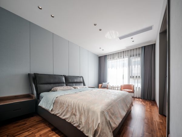 卧室地面采用了木纹地板,具有吸声、保温、柔和的特点,其色彩和质感与卧室的使用功能及氛围营造比较协调,照明创造出一种柔和、朦胧、静谧的气氛,使整体空间感觉更加丰富,大而不空、厚而不重,有格调又不显压抑。背景墙在打造方式上干净利落,细节上追求精致卓越,在色彩上柔和而成熟,造型简朴优美,布局对称雅致,崇尚自然情趣,体现出中国传统美学的精神与人们对中式古典感觉的理解与追求。以现代人的审美需求来打造富有传统韵味的事物,让传统艺术的脉络传承下去。