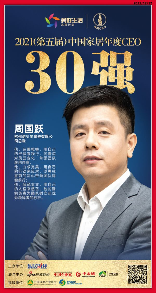 新浪家居讯 12月12日,2021(第五届)中国地产新时代盛典在北京举行,“2021中国家居年度CEO30强”榜单揭晓。诺贝尔陶瓷总裁周国跃荣获“2021中国家居年度CEO30强”。