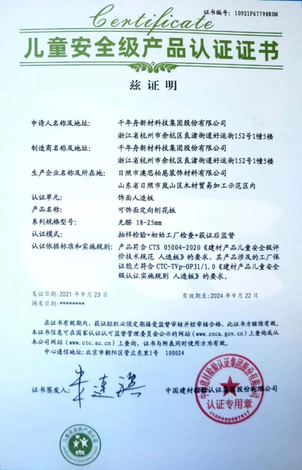 近日,千年舟集团旗下可饰面定向刨花板(LSB高能家居板)产品、刨花板(澳松板)产品经过一系列严格的审查及评审,凭借自身强大的品牌实力与健康环保的产品,顺利通过《儿童安全级产品认证》,并取得相关证书。