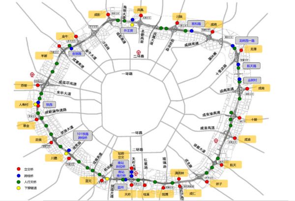 成都三环路是成都市中心城区一条环线城市快速道路,路线总长约51.08km,于2002年10月28日正式建成通车;依次经过金牛区、青羊区、武侯区、锦江区、龙泉驿区、成华区,沿线各区为成都市中心城区,涉及川陕立交,交大立交、羊犀立交、苏坡立交、草金立交、武侯立交、琉璃立交、娇子立交、航天立交、成渝立交、成南立交、龙潭立交、成绵立交等,合计 68 座桥梁和 4 座隧道,其中桥梁包含 33 座人行天桥、11 座跨线桥、24 座立交。由于桥梁现状(功能性、美观性)不足以满足新时代公园城市发展新要求及大运会契机下城市展示作用,因此需要对城市桥梁进行保养维护。