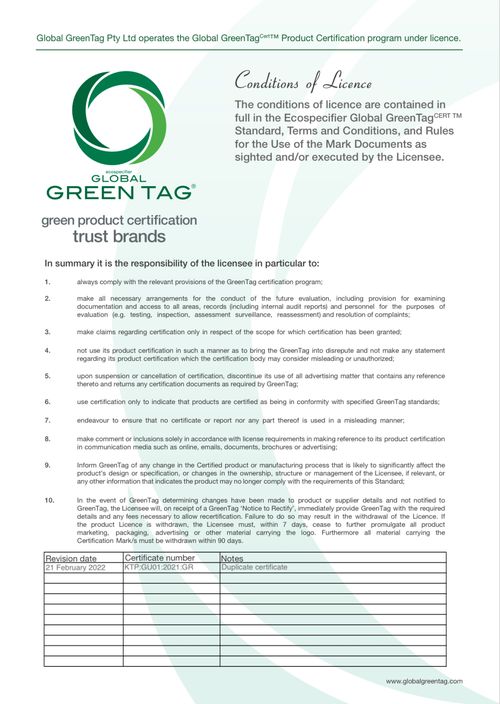 近日,冠星陶瓷企业荣获由Global Green Tag认证中心颁发的“国际绿色产品认证”证书!Global Green Tag是澳大利亚,乃至全球最大的产品可持续性认证体系之一,该认证被澳大利亚公平竞争和消费者委员会(ACCC)、美国专利商标局和绿色建筑评级部门批准的唯一认证标志。