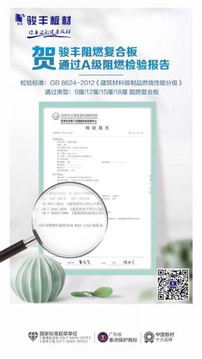 骏丰从2006年就开始推出阻燃板系列产品,并在业内率先获得B1级《公共场所阻燃制品及组件标识使用证书》。通过不断的创新研发,骏丰板材最近推出的多功能复合阻燃板,可以达到A2级阻燃标准。