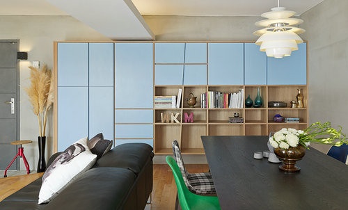 餐厅壁面则搭配涂以蓝色裸裎管线,使空间感更为活泼立体,与一旁柔蓝色挑高书柜相对应,形成空间中有趣对话。而家中另一特色为屋主所收藏的餐椅,亦展现男主人对于挑选家具独到的品味,也使整体空间增加了话题性!