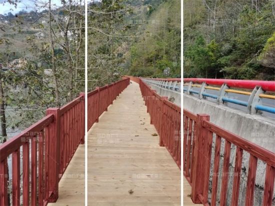 本项目采用13号色郎窑红色。深红的色泽与云南的青山碧水形成了鲜明的对比,给金属的护栏增加了自然的韵味和民族的风采。凭栏小憩,是于圈圈仿木纹中闲凭栏干望落晖的悠闲,是于清雅木韵间花映柳条吹绿萍,凭栏窥细浪的惬意,是莫艺水性仿木纹漆为金属材质护栏赋予的见素抱朴的古韵和质感。