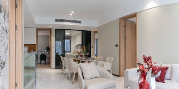 而与这近乎完美的产品形态相匹配的,还有将高配进行到底的精装修和尺度惊人的户型结构。如墙布、电视背景墙、德国原装进口的高仪龙头和花洒、摩恩智能马桶、末端净水器、老板的油烟机、燃气灶、洗碗机三件套,以及东芝中央空调等等。