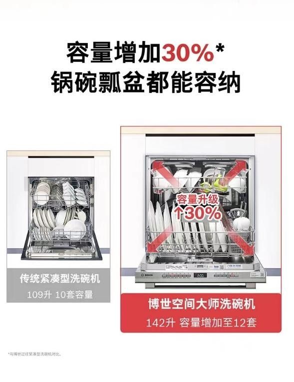 相比市面传统紧凑型洗碗机,博世空间大师洗碗机提升了机身高度,内部通量实现了30%1的提升。142升的洗碗机内腔容量,可容纳12套中式餐具一次洗涤,轻松满足六菜一汤的家庭聚餐碗碟清洁需求。值得一提的是,空间大师洗碗机不仅省时省心,更能节省水电:以洗涤12套标准餐具为例,手洗用水量约为99.8L,而博世洗碗机在节能洗程序下清洗餐具所使用的总用水量少于12L,仅占手洗用水量的1/8,达行业一级水效标准。