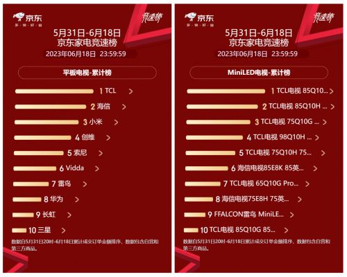 伴随着618的结束,年中各品牌的“大考”也正式落下帷幕了,在家电领域今年TCL的表现可谓是相当亮眼,TCL 618电视销量排名第一,总销售额位列榜首,且一举夺得了包括Mini LED电视、量子点电视、75吋+超大板电视、98吋巨幕电视在内的多项全网销量与销售额的双冠军。尤其是在Mini LED电视领域,更是获得了京东竞速榜排名前十占八的表现,可谓是霸榜618。