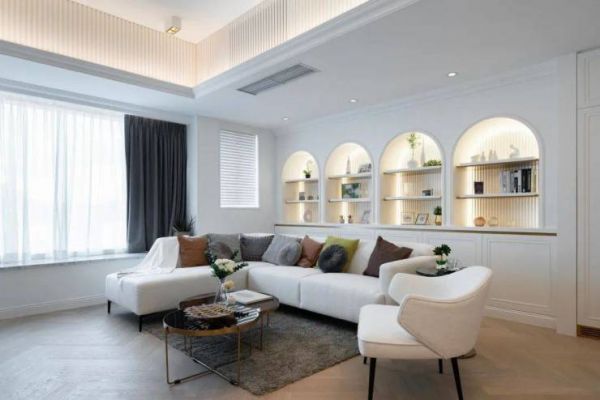 比如客厅的内嵌的四联拱门、灯统一都是现代简约款,白色之外的辅助色都是莫兰迪褐色,全屋看起来就不会乱。