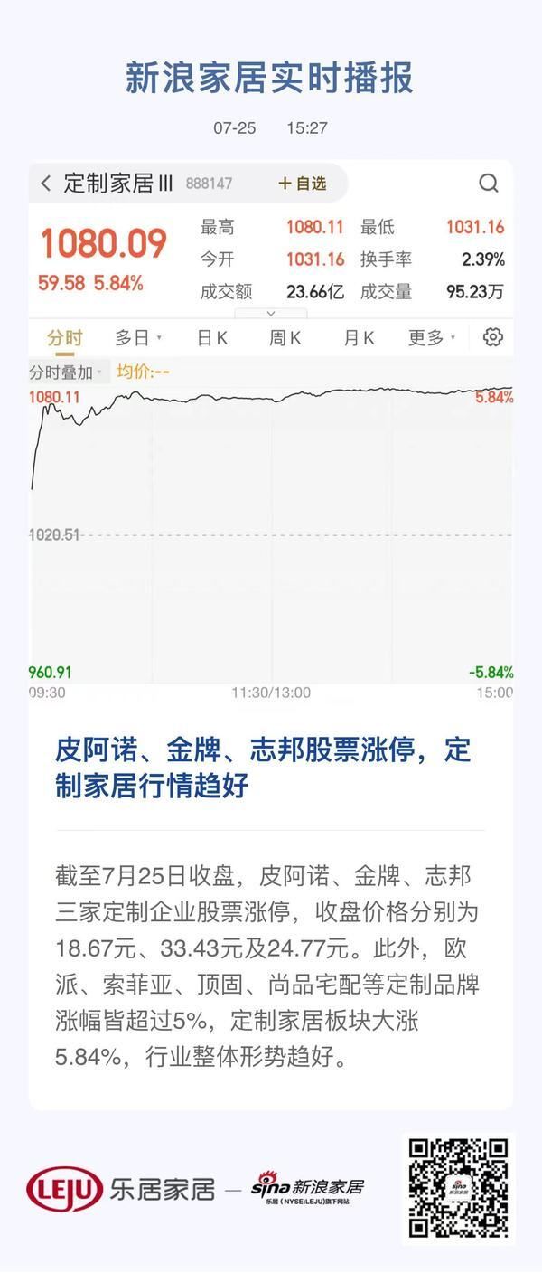 截至7月25日收盘,皮阿诺、金牌、志邦三家定制企业股票涨停,收盘价格分别为18.67元、33.43元及24.77元。此外,欧派、索菲亚、顶固、尚品宅配等定制品牌涨幅皆超过5%,定制家居板块大涨5.84%,行业整体形势趋好。