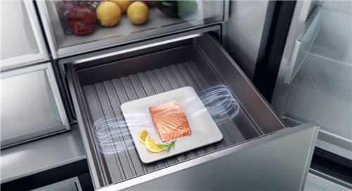 不同于冷风直吹冻肉的风冷冰箱,海尔博观冰箱通过颠覆传统制冷系统实现冷风平行于抽屉,而不直吹食材,避免被风干;其次,由此造成的上下部压强差可以快速带走抽屉热量,实现温度波动≤0.1℃,避免食材因反复冻融造成营养流失。借助这样的创新科技,牛肉存30天原汁原味,海参、松茸的弹嫩、鲜香口感完美保留。