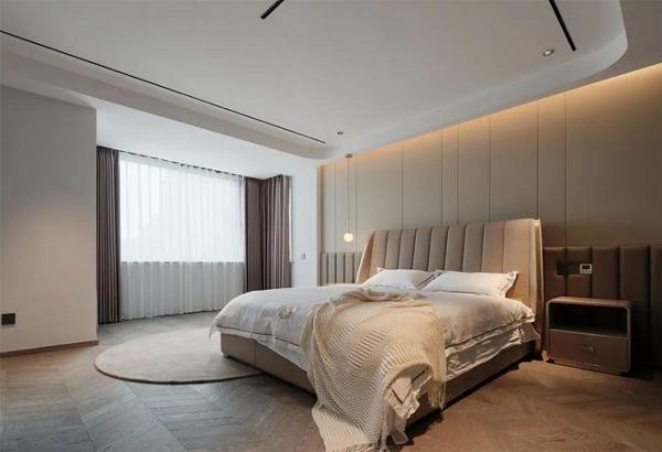清浅的咖色纯净又柔和,塑造出卧室的温馨安静。无主灯的空间以射灯和线灯烘托慵懒舒适的氛围,让人沉浸其中。