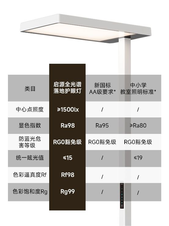 启源全光谱护眼落地灯的各项指标远超现行教室照明标准,旨在以更高规格的品质要求,为孩子们打造一个既安全又高效的视觉环境。