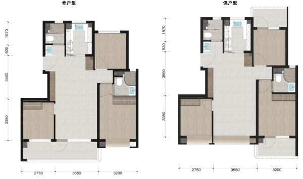 约89㎡三居:双卫格局,主卧套间设计, U型厨房的设计。奇户型是飘窗+阳台,偶户型客厅转角飘窗+客厅阳台。