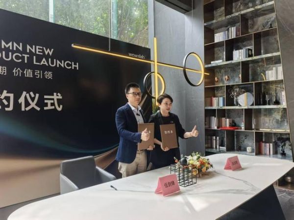 本次发布会的两大签约仪式,成为华岩品致布局未来的重要见证。伍剑锋董事长先是与汤洁明总经理共同签署总部展厅扩容协议,他表示:“展厅扩容是品牌实力提升的直接体现,未来将为客户呈现更完整、更专业的岩板空间解决方案。”