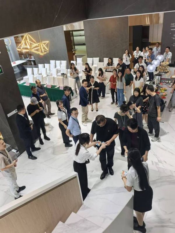 活动现场,嘉宾与媒体在工作人员引导下沉浸式品鉴2025秋季新品,近距离感受“奥克兰”的天然纯净、“西砂”的丝滑温润、“细纹鱼肚金”的奢华质感,亲身验证华岩品致的产品实力。现场还通过互动点赞评选出“最受欢迎新品”,氛围热烈非凡。