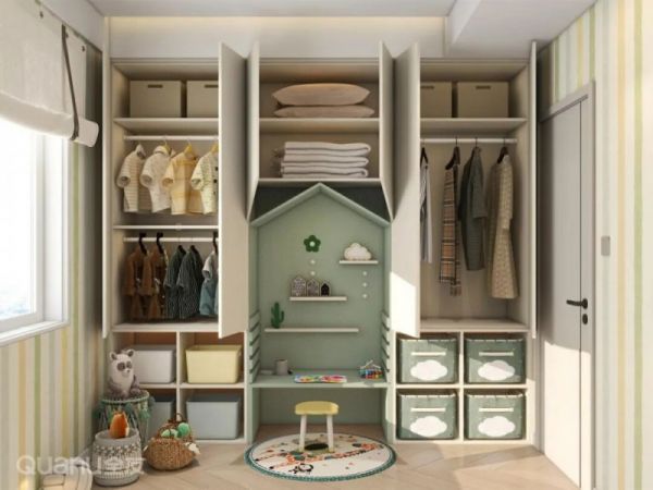 配置可变收纳衣柜,早期衣柜下层可收纳宝宝玩具,中层预留空间放长辈陪睡衣物;孩子长大后,玩具区改为书籍收纳区,中层增设挂杆收纳长衣,无需更换衣柜,仅调整内部布局即可适配新需求。