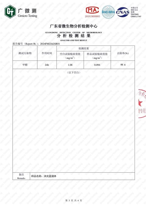 根据《中国室内空气质量标准》(GB/T18883-2002)的深度测评,沐光蓝甲醛清除剂表现优异。
