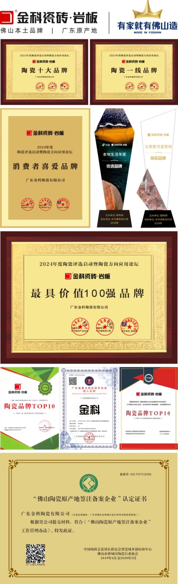 这份对极致品质的坚持,为金科赢得众多权威认可:获评“高新技术企业”、“广东省守合同重信用企业”,跻身“陶瓷品牌TOP10”、“陶瓷十大品牌”,入选“佛山陶瓷原产地企业”等。累计荣获八十多项重要荣誉,这些成绩,不仅是实力的见证,更是金科陶瓷“状元级”行业地位的坚实印证!
