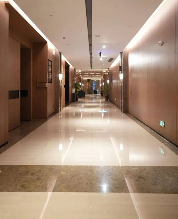 步入宴会厅,冠珠「金丝格雷卡尔」以纯粹的色彩与温润的光泽,带来静雅大气的空间基调,连贯的版面设计延伸了视觉效果,赋予空间整体感与叙事感。冠珠「金丝格雷卡尔」同步应用在电梯厅区域,其耐磨防污特性更经受住了高频使用的考验,成为公共区域品质与美学的双重保障。