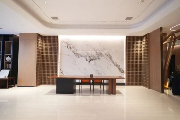 移步至会议厅,墙面以大规格岩板香雪梅作为背景墙铺陈开来,其纹理犹如雪落梅枝,轻盈舒展,为严谨的商务空间平添一份独特雅韵。