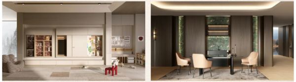 本次秋季新品有隐奢、卢瓦尔、屿你、睿构等多款整家定制系列产品,用设计语言将“家”的温度与个性融入每一处细节。隐奢系列,作为高端整木定制力作,采用水性油漆与天然木皮工艺,以大圆弧造型、严谨收口细节,重新定义“隐于形,显于质”的定制哲学;卢瓦尔系列,以轻法复古风勾勒生活的浪漫轮廓,灵感源自法国古堡建筑,融合雕花线条、油砂玻璃与仿纯色墙面纹理,再现法式优雅;屿你系列,专注现代奶油风的温暖表达,通过静电喷粉工艺门板、火山石纹花色,以及圆弧设计,营造安全、灵动且充满想象的空间;而睿构系列,以模块化设计回应自由职业者的个性主张,隐藏拉手、亚马逊绿石纹背板、旋转包柜与抽拉台面等,打破传统定制的边界,让收纳与颜值并存。