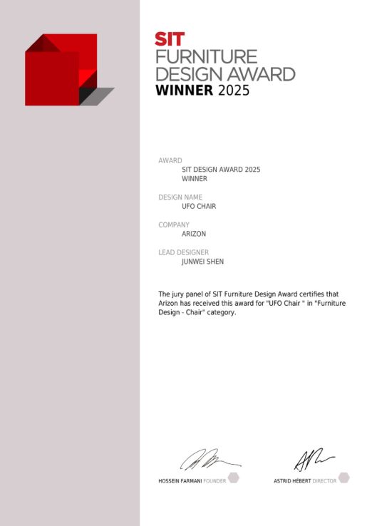 2025年5月28日, 瑞士SIT FURNITURE DESIGN AWARD 2025 家具设计大奖揭晓其最终获奖名单。ARIZON乾正作品「UFO Chair飞碟椅」,成功斩获SIT家具设计奖专业组大奖!