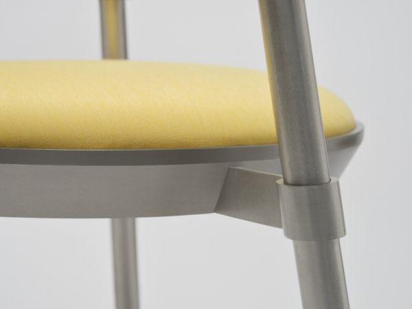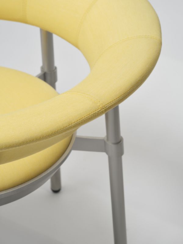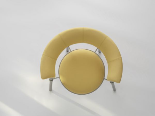其碟状圆形轮廓,通过不锈钢框架的金属质感诠释,体现了人体工业美学。椅子以其童趣与未来感的魅力引人注目。多款材质体系精准适配各种场景,高密度防水科技面料适用于户外环境,亲肤透气的皮革则提升了室内的质感。柔软的坐垫和靠背带来舒适沉浸的坐感。