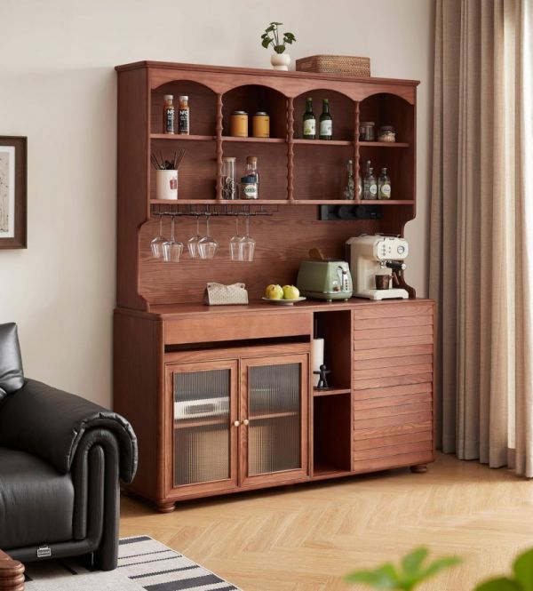 中古风餐边柜,波浪弧形装饰门框设计,洋溢复古情调。多重收纳分区规划合理,上部开放格与中部置物区方便常用物品取放,底部四抽搭配长虹玻璃双开门,轻盈通透且收纳有序,保持餐厅整洁清爽。柜内配置可移动插座,小家电使用更便捷。