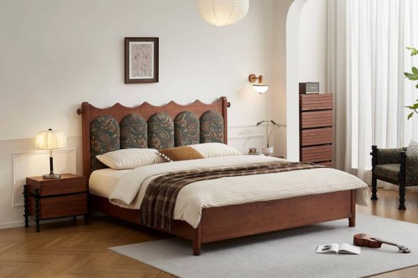 中古风软包床,床头以灵动波浪曲线勾勒,搭配艺术感布艺花纹,视觉层次丰富,浪漫复古气息扑面而来。拱形布艺软包填充饱满,倚靠舒适放松。床头两侧设置实木挂钉,方便悬挂帽子、围巾等小物。床板与床边采用燕尾榫开槽工艺,结构受力均匀,稳固耐用。