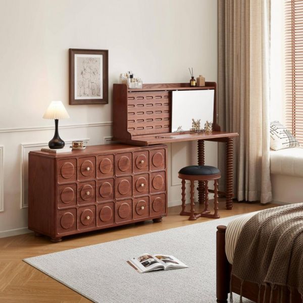 多功能六斗柜搭配置物架,可自由调节长度与角度,适应多样空间需求。门板运用圆形立体铣型工艺,造型立体富有层次。纯铜拉手点缀其间,复古优雅,开合顺手自然。创意罗马柱腿,稳稳托起梳妆日常。