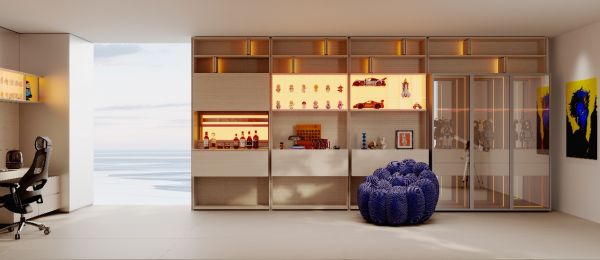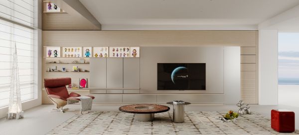 拒绝杂乱无章!隐序收纳才是高阶玩法。悦己的科技设备统统无缝“隐入”收纳系统,留下的只有恰到好处的仪式感与情绪价值。相拥观影时,激光投影仪和画轴幕布从前后柜内缓缓升起,灯光调至渐暗,氛围瞬间拉满。游戏开始前,随手拿取嵌入式“能量补给站”(嵌入式冰箱)内的冰镇饮料,让快乐加倍不停。空气污浊时,新风系统悄然启动,清新空气让大脑思维更活跃,carry全场不掉线。