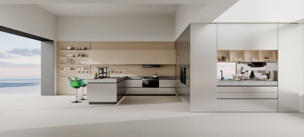 空间的智慧不止于沉浸式的娱乐,更在于场景的无缝切换。从声光交织的次元壁中走出,流转至人间烟火平衡日常。可见,西厨通过隐序收纳与智慧设计,成为社交C位,并巧妙利用高柜实现中西厨模式完美切换。