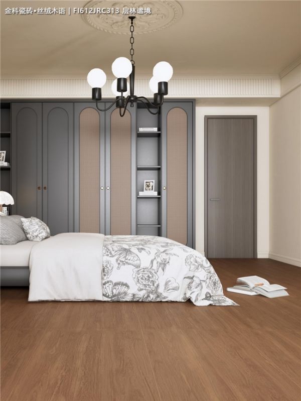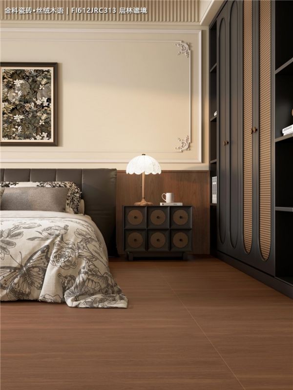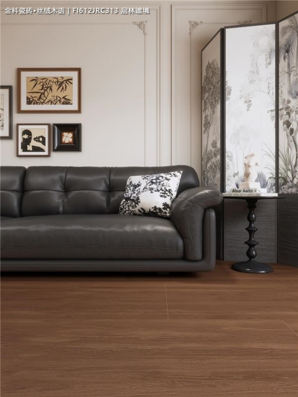 从客厅到卧室,这款深色木纹砖与️皮质沙发、藤编单椅、️中式屏风等元素混搭也毫不违和,轻松营造出沉稳静谧、充满故事感的家。