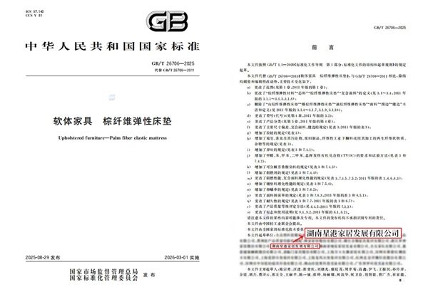 《GB/T 26706-2025 软体家具 棕纤维弹性床垫》国家标准的实施,为行业划定了明确的起跑线,而星港家居不仅是规则的遵循者,更是规则的共同制定者与品质的先行者。