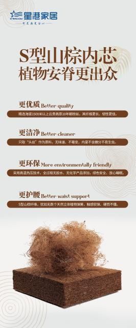 · 源头之选,定义更优质的支撑:星港棕床垫坚定地选用S型山棕,精选海拔1500米以上云贵高原10年期棕丝。这些生长周期长的纤维更长、韧性更佳。星港更极致地只取“头丝”作为原料,确保内里不含糖分,从根源上实现无味道、不霉变、不易生虫的洁净品质。
