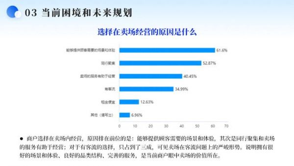 商户选择在卖场内经营,原因排在前位的是:能够提供顾客需要的场景和体验,其次是同行聚集和卖场的服务有助于经营;对于有客流的选择,只占到了三成,可见卖场在客流问题上的严峻形势。