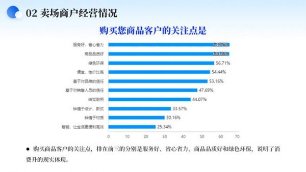 购买商品客户的关注点,排在前三的分别是服务好、省心省力,商品品质好和绿色环保,说明了消费升级的现实体现。