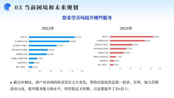 跟去年相比,商户对卖场的诉求没有太大变化,帮助引流依然是第一诉求。另外,加大营销活动力度,提升服务能力和水平、经营稳定不折腾,占比都提升了5%以上。